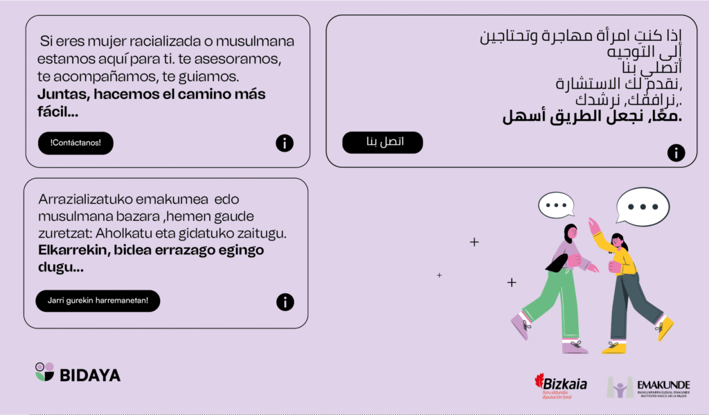 Sigue siendo uno de los recursos más importantes que ofrece Bidaya Elkartea al colectivo de personas migradas de diferentes orígenes, principalmente árabe. En 2024 hemos sostenido la dedicación a este espacio para dar respuesta al conocimiento y reconocimiento que ya se tiene de nosotras; no solo por parte de las propias mujeres migradas, sino también de otras entidades sociales que nos derivan casos. Nos hemos convertido en un punto de consulta, en idioma originario, sobre las dudas básicas de extranjería y asentamiento.